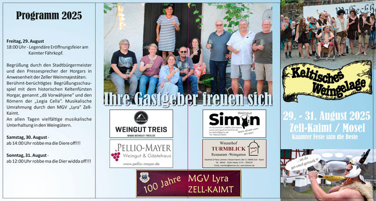 Vom 29.-31. August feiern wir unser alljährliches Keltisches Weingelage. Es wartet ein ganzes Wochenende bester Unterhaltung, hervorragender Wein und deftige Speisen auf euch! Besonders freuen wir uns darauf, mit euch bei stimmungsvoller Live-Musik zu feiern, Freitagabend mit "Dä Wenkerschorsch" und Samstagabend mit dem Akustik-Duo Sarah Röhl und Henrik Schuld. Das dürft ihr nicht verpassen!